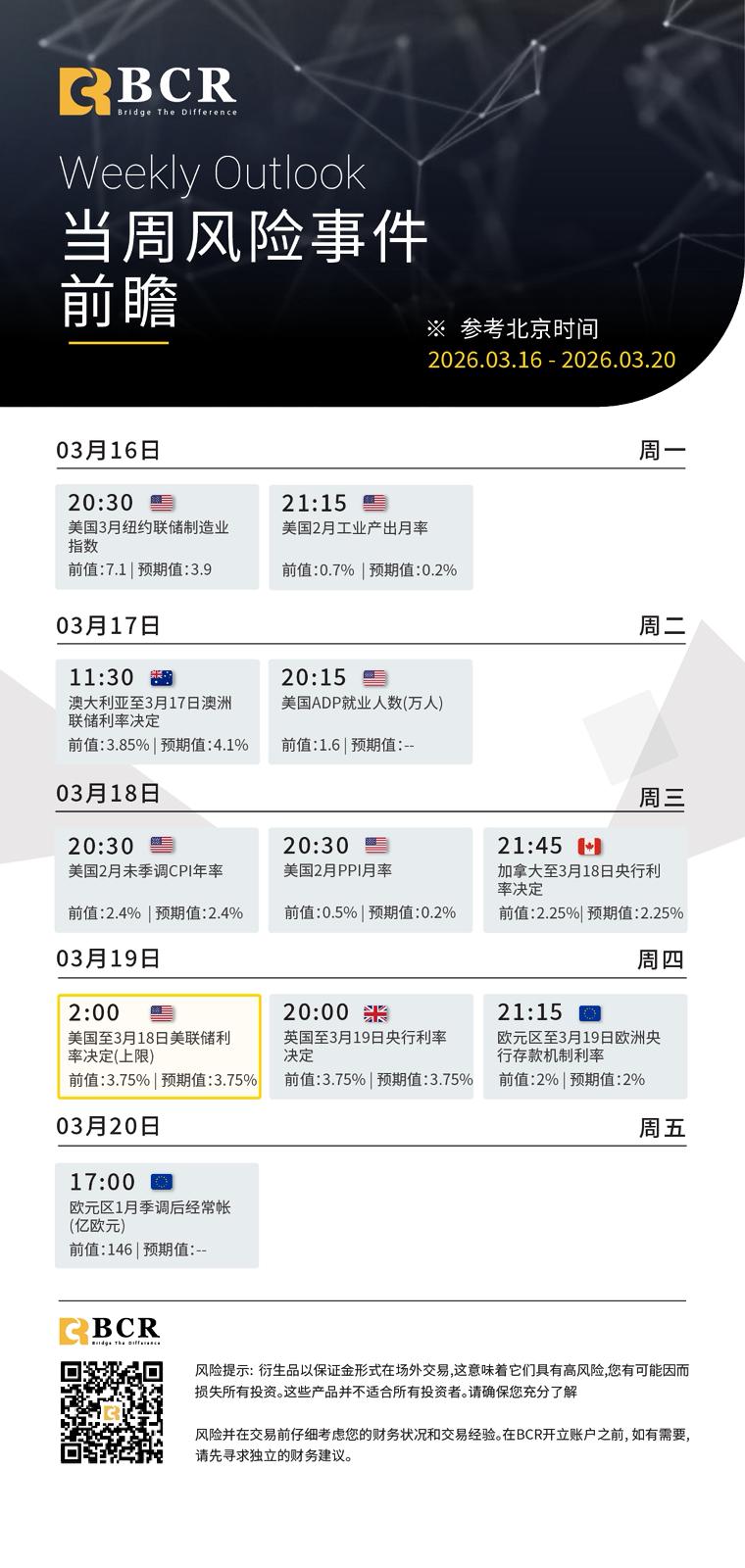 每周风险事件前瞻 : 3 月 16 日—3 月 20 日