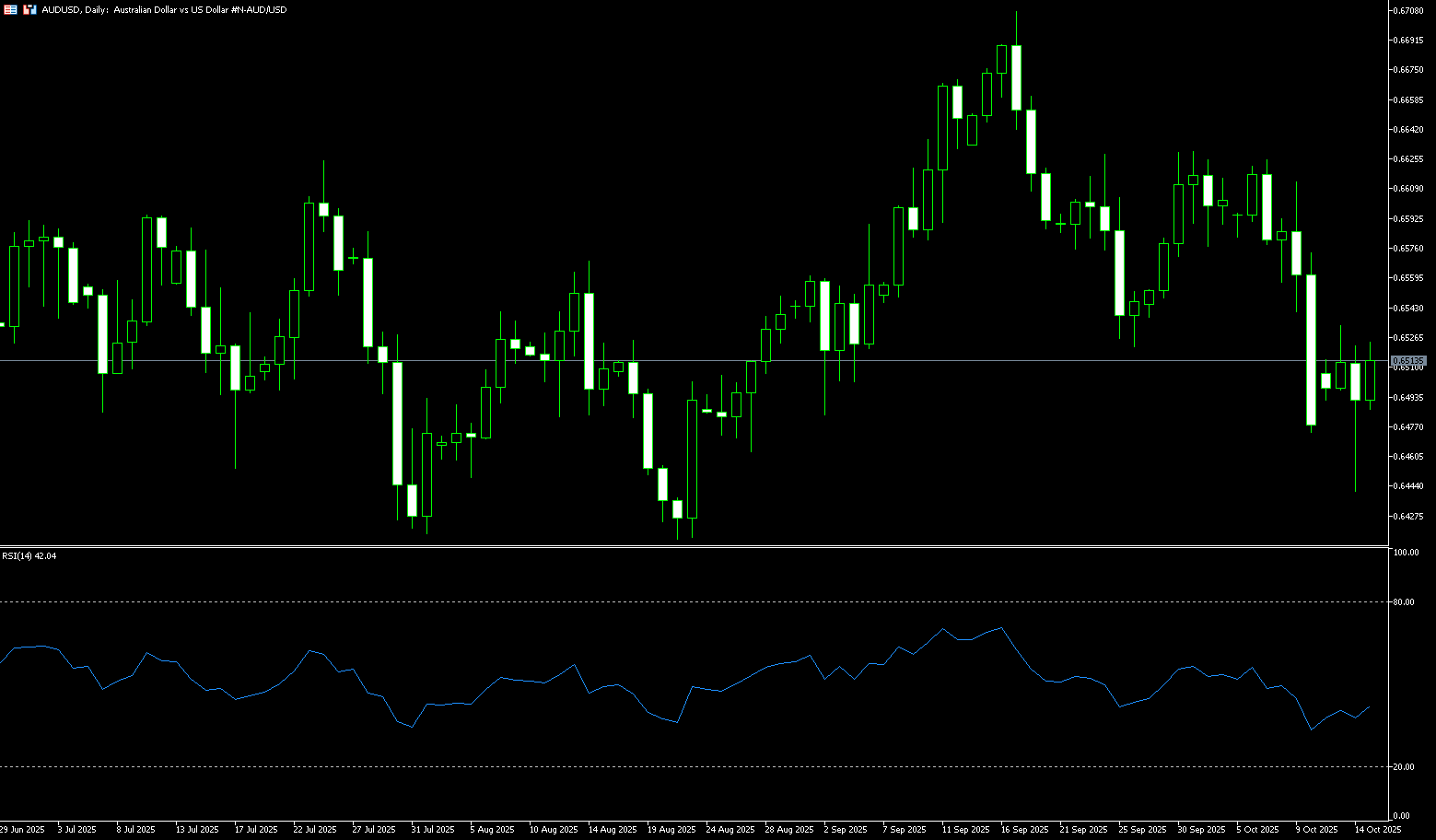 The Australian dollar (AUD)/US dollar (USD) exchange rate retraced around 0.6500 on Wednesday. Technical analysis on the daily chart suggests a bearish bias. Furthermore, the 14-day relative strength index (RSI) remains below 50, further reinforcing the bearish bias. On the downside, AUD/USD could target Tuesday's near two-month low of around 0.6440. A break above this channel would strengthen the bearish bias and prompt the pair to test the four-month low of 0.6414 set on August 21, followed by the 0.6400 round-figure mark. Key resistance lies near the 14-day simple moving average at 0.6562, followed by the psychologically important 0.6600 level. A break above these levels would improve short- and medium-term price momentum and allow AUD/USD to test the October 1 high of 0.6629.