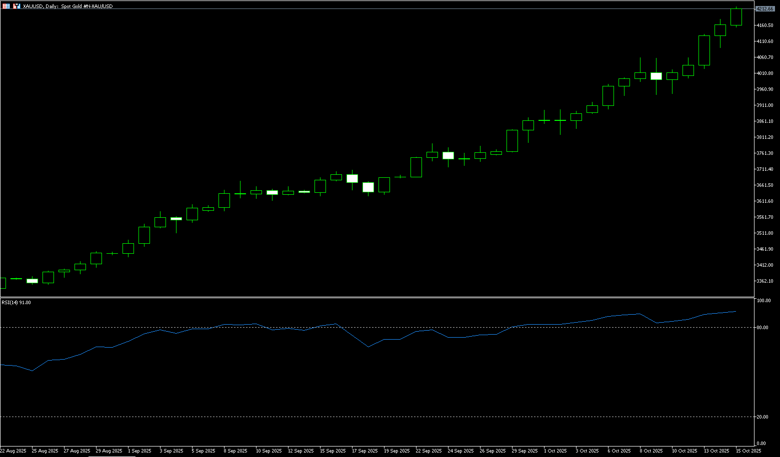 Spot gold hit a new all-time high near $4,218.20/oz in early trading on Wednesday. Gold prices reached a high of $4,179.50/oz on Tuesday, as expectations of a Federal Reserve rate cut this month and escalating trade tensions fueled risk aversion. The gold price rally is driven by multiple factors, including geopolitical uncertainty, expectations of a US rate cut, strong buying from central banks, and inflows into gold exchange-traded funds (ETFs). Bank of America and Societe Generale currently forecast gold prices to reach $5,000/oz by 2026. Escalating trade tensions, the ongoing US government shutdown, and market expectations of further Federal Reserve easing are all supporting gold prices. The global trend of de-dollarization could push gold prices to $5,000 per ounce by the middle of next year.