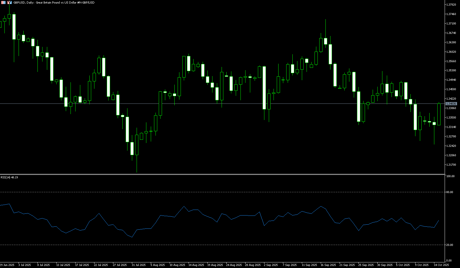 GBP/USD recovered losses from the previous two consecutive sessions during Wednesday's Asian session, trading around 1.3380. The US dollar declined, driving the pair higher, as the likelihood of further Federal Reserve rate cuts in 2025 increased. The likelihood of further rate cuts increased after Federal Reserve Chairman Powell stated on Tuesday that the Fed is on track to cut interest rates by another 25 basis points later this month, despite the government shutdown significantly dampening economic sentiment. Powell highlighted the low pace of hiring and noted that this trend could weaken further. GBP/USD's upside may be limited due to signs of a cooling UK labor market, which has reinforced market expectations for further Bank of England rate cuts throughout the year. According to Reuters, traders expect the Bank of England to cut interest rates by another 46 basis points this year.
