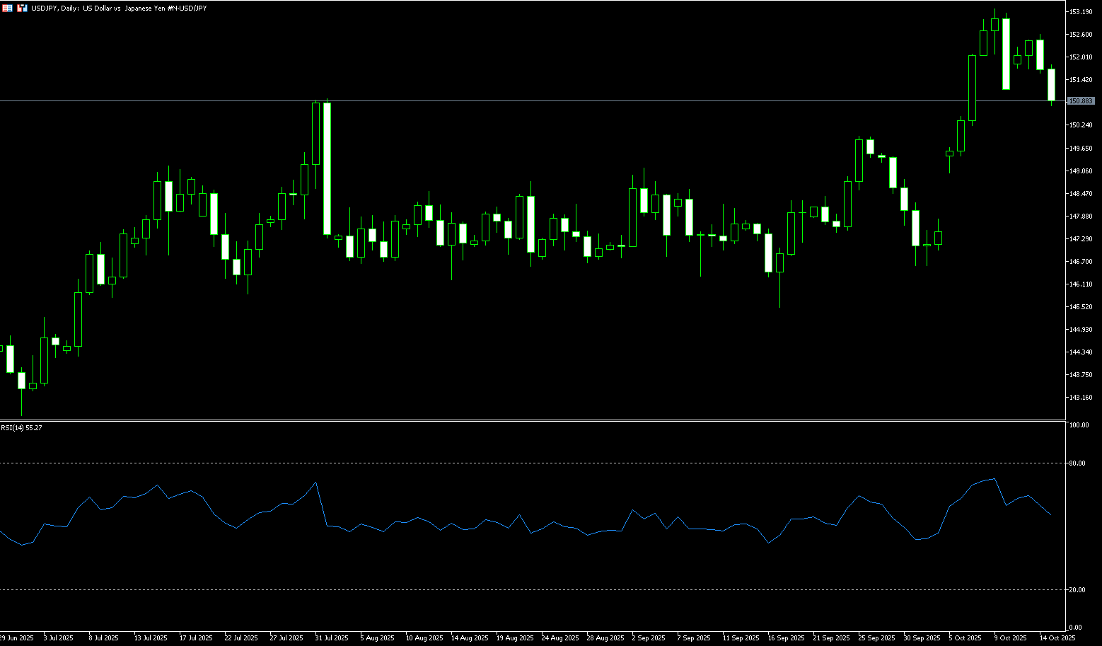 The daily chart shows that USD/JPY has failed to break above its 10-day simple moving average of 150.92 several times this week, subsequently breaking below its 9-day simple moving average, around the 151.35 area. This could be seen as a key trigger for USD/JPY bearish sentiment. A sustained breakout and acceptance below the 151.00 level would reaffirm the negative outlook and drag the spot price to the October 7 low of 150.24. A break below this level would target the psychological 150.00 level. On the other hand, any intraday rebound above the 151.65-151.70 area would likely face immediate resistance near the 152.00 round-figure mark. Further gains could attract some selling in the 152.25 area and be capped at 152.61 (Tuesday's high). A sustained strong break above the latter level could shift bullish traders' appetite and push USD/JPY towards the 153.00 level.