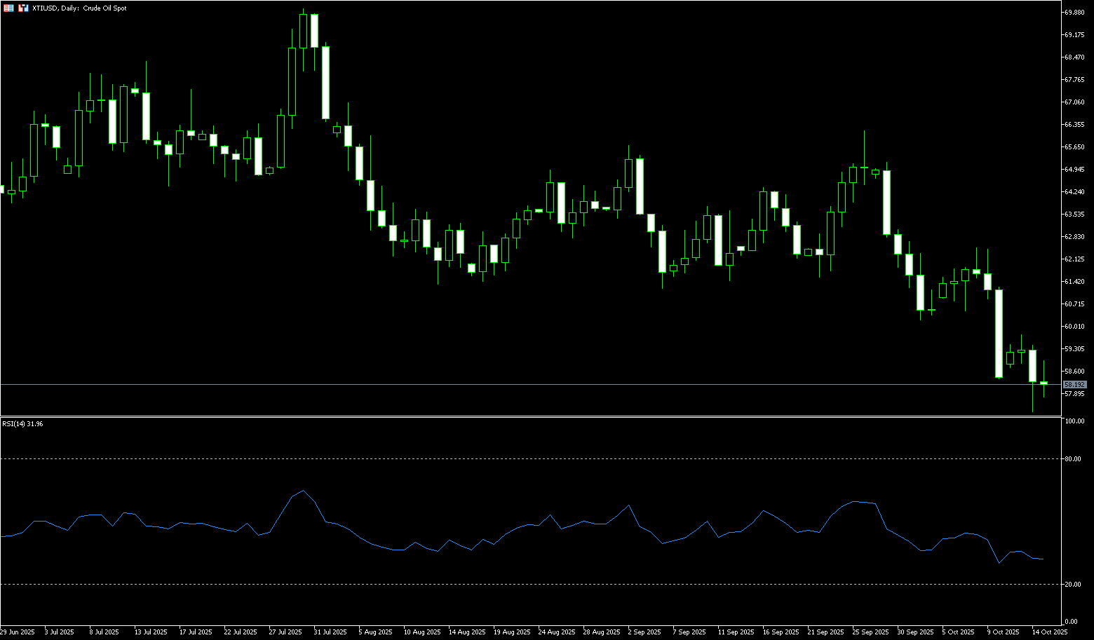 From a technical perspective, WTI crude oil prices remain firmly bearish. Prices remain below the psychologically important $60.00 level. They remain below the 21-day (61.79), 50-day (62.56), and 100-day (64.43) simple moving averages, collectively forming a solid ceiling for near-term prices. The 14-day relative strength index (RSI) hovers below 40, indicating strong bearish momentum but not oversold territory, suggesting further downside potential. On the downside, immediate support lies at Tuesday's swing low of $57.32. A break below this level could challenge the year's low near $55.14 (May 5 low). On the upside, oil prices face initial resistance at the psychologically important $60 level. Even if this level is broken, a corrective rally to $61.79 (the 21-day simple moving average) will be challenging. Any upward move is likely to be short-lived as long as oil prices fail to reclaim this key moving average.