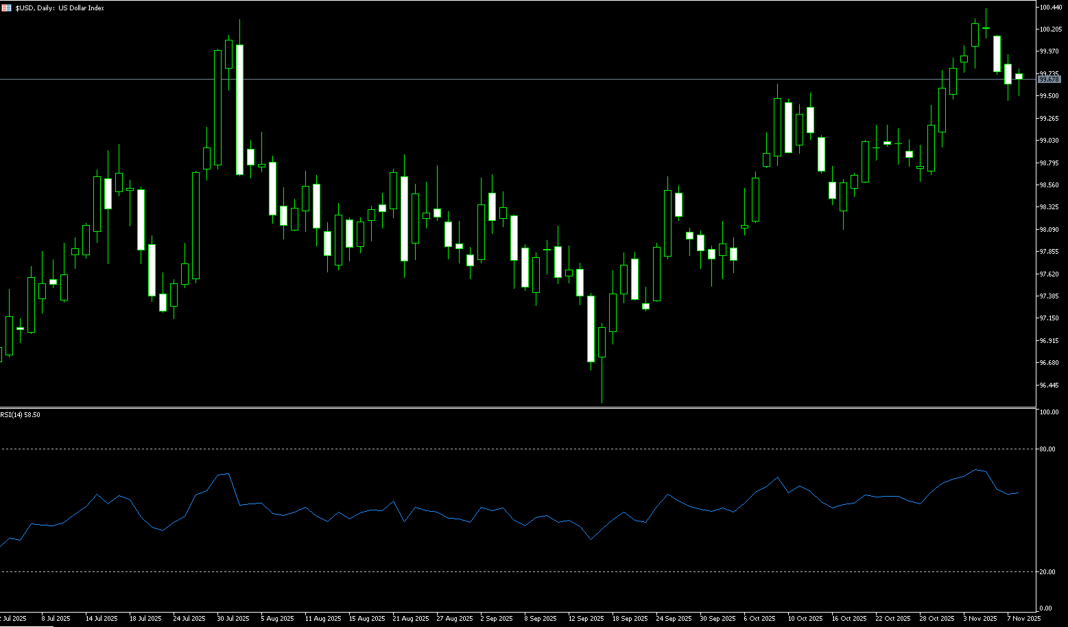 Since hitting a yearly low of 96.22 in mid-September, the US dollar index has risen by more than 3%. Momentum indicators continue to lean bullish: the 14-day Relative Strength Index (RSI) has fallen to around 56, suggesting further gains are still expected, while the Average Directional Index (ADX) above 23 indicates a strengthening trend. However, a more sustainable rally would require the dollar index to break through the psychological level of 100.00 and the key 200-day simple moving average at 100.21 in a compelling manner. If the dollar index also breaks through the November 5 high of 100.36, it could head towards the weekly high of 100.54 on May 29, followed by the psychological level of 101.00. Conversely, temporary support lies at the 50-day simple moving average at 99.21, with the next support level at the psychological level of 99.00. A deeper pullback could test the 34-day simple moving average at 98.85, followed by the October 28 low of 98.57.