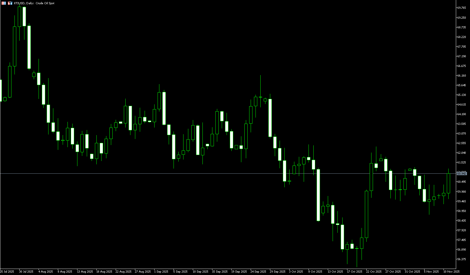 From a technical perspective, crude oil is stuck in a stalemate. Unless a key price level is broken, it will likely remain range-bound; oil prices are trading between $61.45 (the 55-day simple moving average) and $58.75 (the November 6th low). The 55-day moving average near $61.45 is providing strong resistance; bulls need a decisive break above this level to open up upward potential to $62.38 (the October 24th high). Conversely, a break below the $59.00 (psychological level) and the $58.75 (November 6th low) support level could trigger a new round of selling down to the $58 level. Until a clear breakout of these key price levels occurs, the market is expected to continue its consolidation and directionless movement. In short, traders are closely watching the developments of the shutdown agreement, but weak demand signals and rising inventories continue to weigh on oil prices. The market has not yet formed a clear trend, requiring a flexible approach.