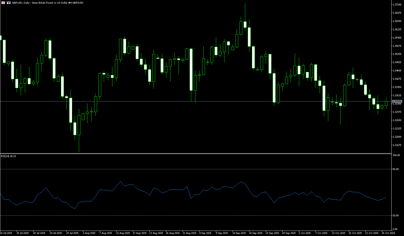 Biểu đồ hàng ngày cho thấy rõ đồng bảng Anh đang dao động trong nửa dưới của Bollinger Band, hiện giao dịch trên đường Bollinger Band dưới tại 1.3273. Các thông số chỉ báo cho thấy trục trung tâm Bollinger Band khoảng 1.3391, và đường trên khoảng 1.3509. Về cấu trúc giá, mức cao trước đó tại 1.3527 (01/10) giảm trở lại mức cao thứ cấp tại 1.3471 (17/10) và sau đó thoái lui xuống 1.3248, nơi nó phục hồi, hình thành mô hình hội tụ ngắn hạn với các mức thấp chưa hình thành và mức cao giảm dần. Các kiểm tra lặp lại của giá hiện tại đối với đường dưới tại 1.3273 gợi ý mô hình điển hình của "hồi quy trung bình yếu": các đợt tăng có khả năng kết thúc tại đường giữa tại 1.3391, với ít tiềm năng mở rộng đến đường trên tại 1.3509. Nếu đường dưới Bollinger Band, giữa 1.3287 (mức thấp tuần trước) và 1.3273 (mức thấp tuần trước), tiếp tục giảm, một kiểm tra lại 1.3248 (mức thấp ngày 14 tháng Mười) là có khả năng; một phá vỡ dưới mức này có thể đẩy giá xuống 1.3200.
