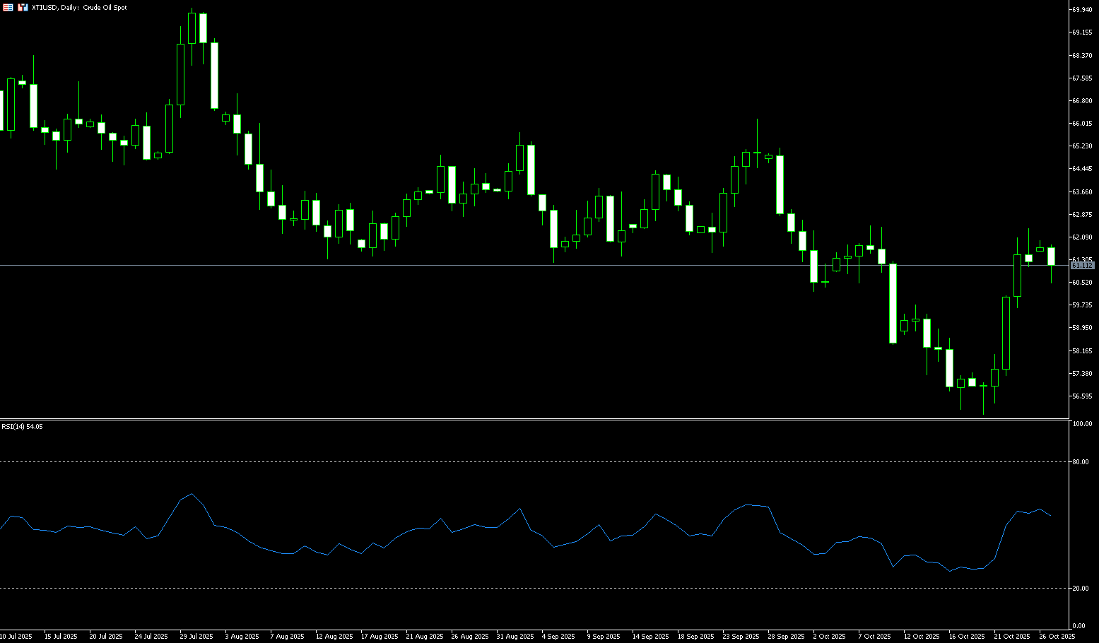 Dầu thô WTI giao dịch gần 61.00 USD. Do các lệnh trừng phạt của Mỹ đối với Nga, Ấn Độ đã giảm nhập khẩu dầu thô Nga, trong khi căng thẳng thương mại giảm bớt đã thúc đẩy nhu cầu. Cả hai chuẩn dầu thô đều tăng trong giao dịch sớm, kéo dài mức tăng hơn 5% sau thông báo trừng phạt vào thứ Năm tuần trước, nhưng thoái lui trong hai giờ giao dịch cuối cùng. Cả hai chuẩn vẫn tăng hơn 7% tuần trước, mức tăng hàng tuần lớn nhất kể từ giữa tháng Sáu. Tổng thống Mỹ Trump áp đặt trừng phạt đối với Rosneft và Lukoil để gây áp lực lên Tổng thống Nga Vladimir Putin chấm dứt chiến tranh ở Ukraine. Trong khi việc giảm căng thẳng thương mại đã thúc đẩy nhu cầu, thị trường đang đánh giá tác động của các lệnh trừng phạt Mỹ đối với dầu thô Nga. Hơn nữa, cuộc đóng cửa chính phủ Mỹ, có thể kéo dài đến cuối tháng Mười Một, đang tăng bất ổn và hạn chế mức tăng giá dầu. Từ góc độ cấu trúc, đợt tăng giá dầu thô hiện tại được thúc đẩy bởi "kỳ vọng cải thiện tâm lý kết hợp với gián đoạn nguồn cung," hơn là phục hồi nhu cầu thuần túy. Do đó, sức bền của xu hướng vẫn cần được xác minh.
